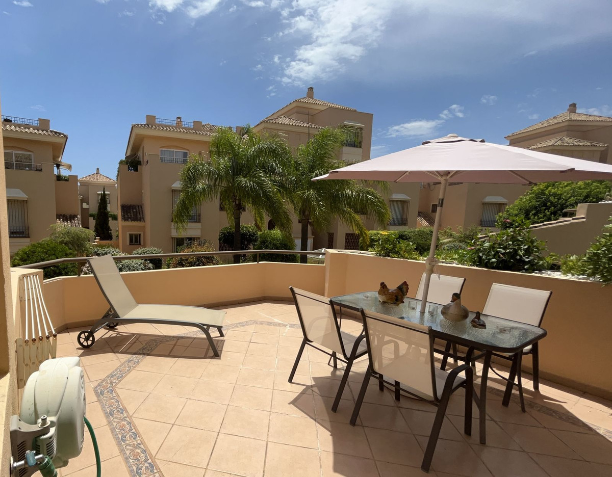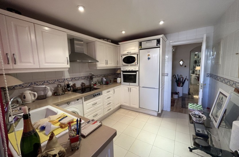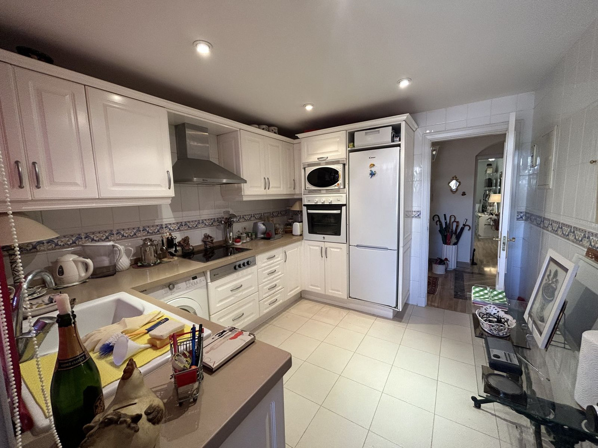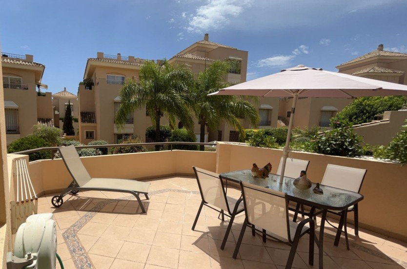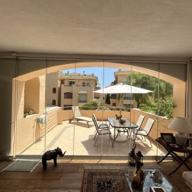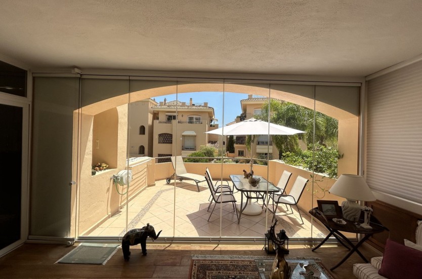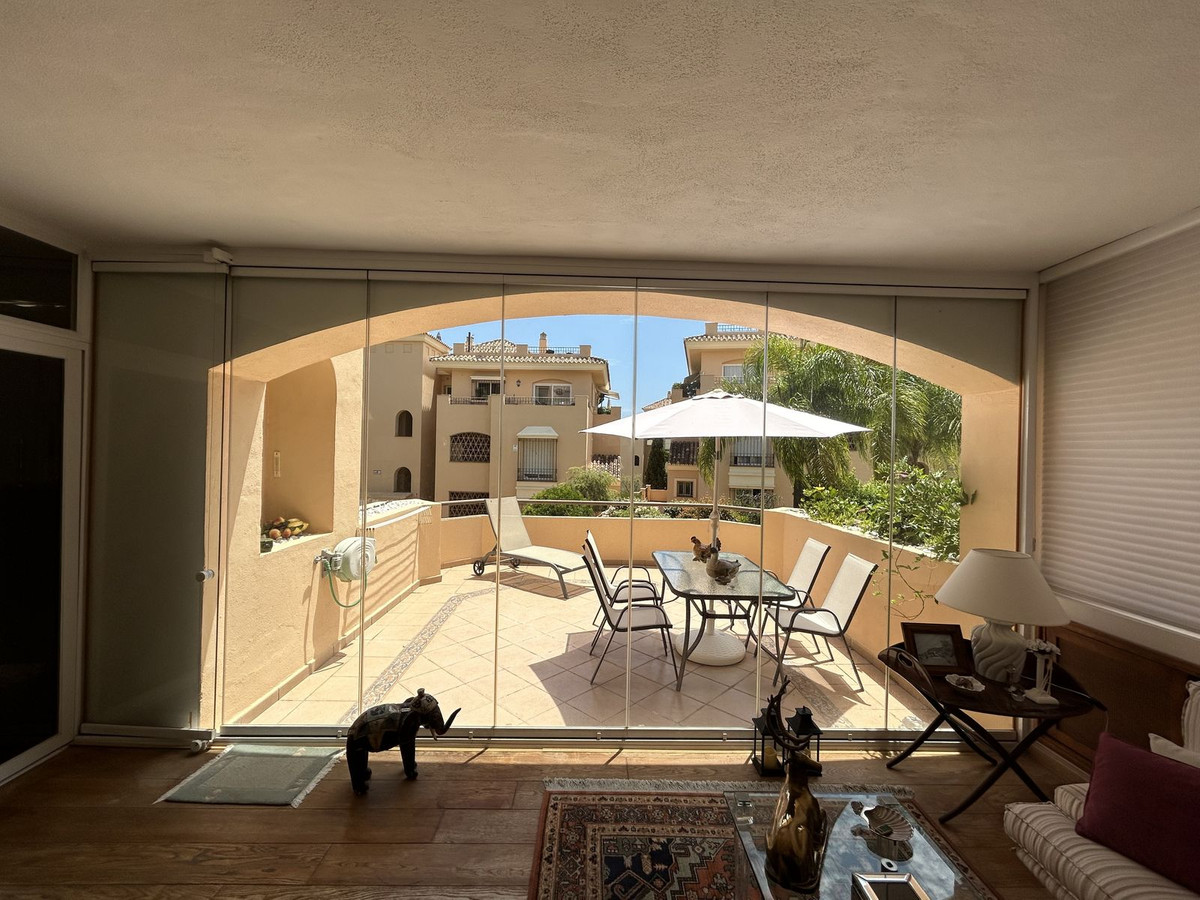 Lovely south facing apartment in Hacienda Elviria within walking distance to amenities. Situated on the 1st floor, it offers an ample living room that leads on to the large terrace that has been partly closed with glass curtains offering more living space in the winter months, a fully fitted kitchen, under floor heating in bathrooms, A/C hot & cold, two garage spaces and one store room.