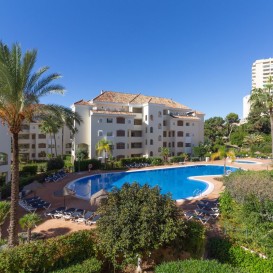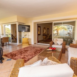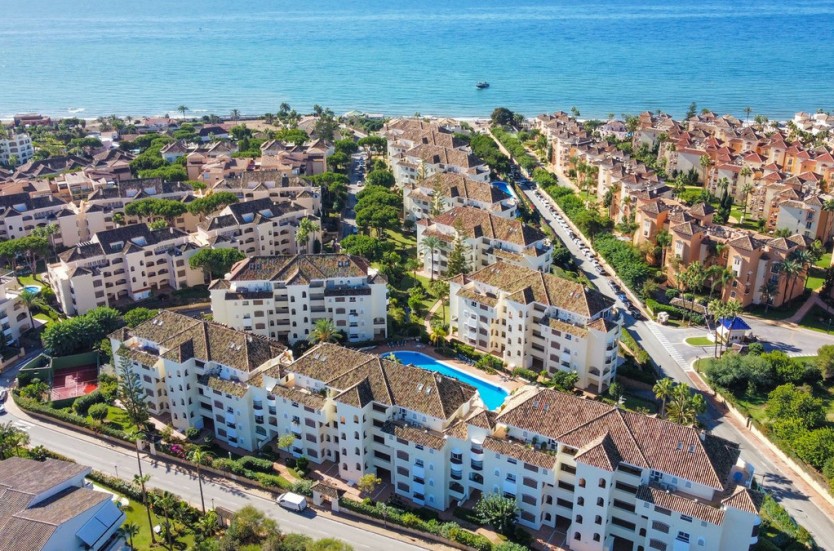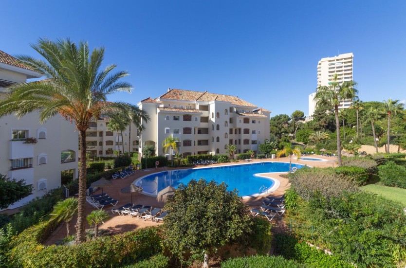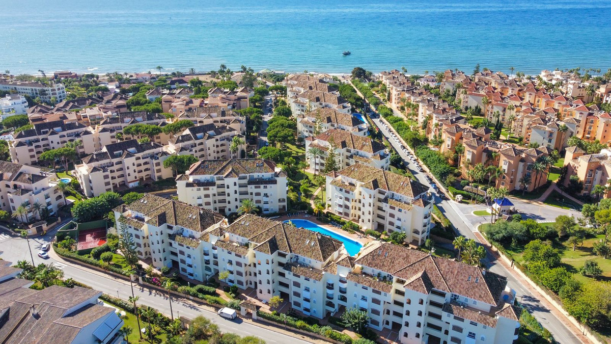 Beautifully presented, corner, South facing and spacious 3 bedroom apartment located in the best complex beach side Elviria. 400 metres from the sandy beaches and close to restaurants, supermarkets and amenities, this wonderful property represents a superb investment, spacious enough to live in full time or as an amazing 2nd home. On entering this 2nd floor apartment, you are greeted by a nice size entry hall. A spacious lounge / dining area leads onto a fully glazed large terrace with ample room for exterior dining, seating and which overlooks the community pool. The glass curtains can be opened during the warmer months and closed during the Winter extending the living area. The terrace also has privacy curtains installed to fully enclose this area. The apartment is completed with a fully fitted kitchen, 3 good sized double bedrooms with fitted wardrobes, one with an ensuite bathroom, a large guest bathroom and a separate guest toilet.The property is fully air conditioned and also includes private parking and storage accessed via the lift.