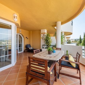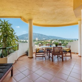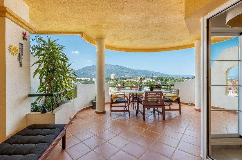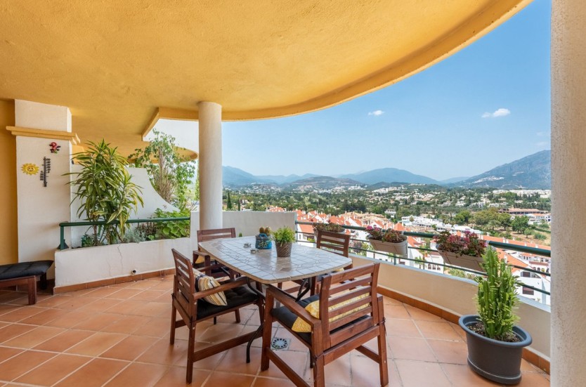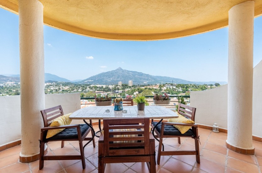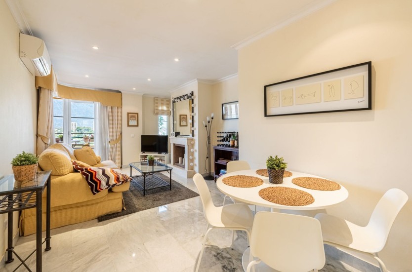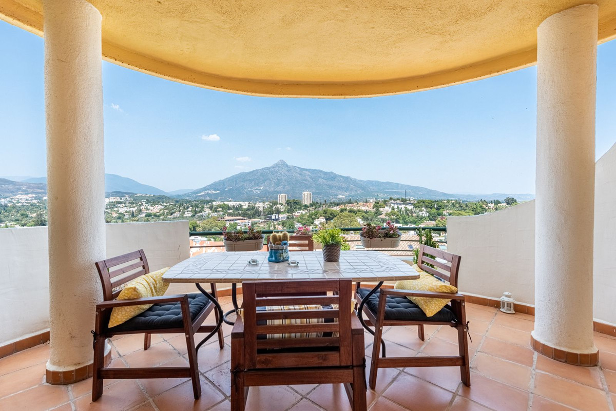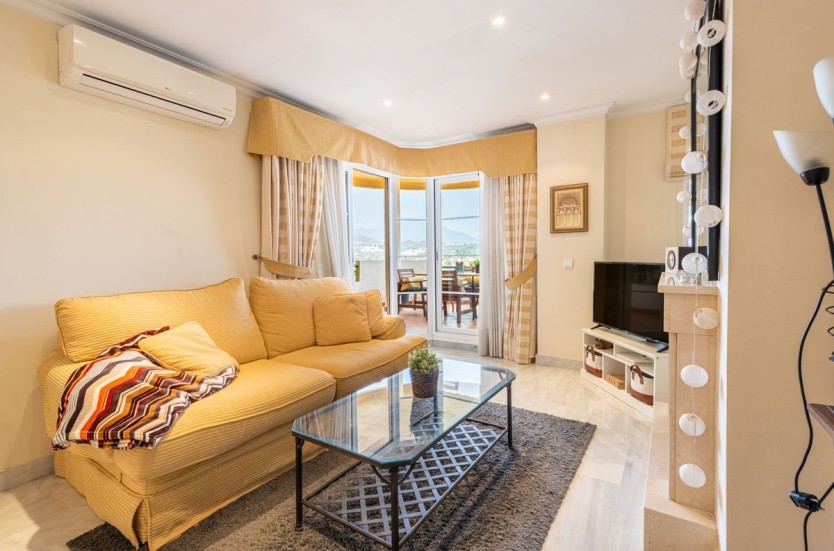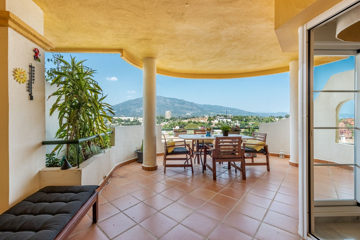 Apartment in a fantastic location in the heart of Nueva Andalucía within walking distance to Centro Plaza, Puerto Banús and the beach.The apartment consists of a spacious living room with dining area and fireplace which has direct access to a large lovely terrace with wonderful views of the valley, La Concha and the sea. A fully equipped kitchen with laundry room, two bedrooms and two bathrooms, one of which has its own smaller terrace with evening sun.