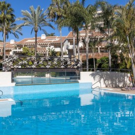 There is also a separate laundry room (utility room) with washing machine and dryer (Miele). The large south facing terrace invites for outdoor living and has been fitted with sun awnings. Underground parking space for 2 cars and 2 storage rooms. The complex with video surveillance is extremely well maintained, with large tropical gardens, a beautifully designed large pool and a smaller heated pool.Beautifully presented with marble floors, hot and cold air conditioning throughout the flat. Also electric shutters (persianas) in all the rooms (living, kitchen and the bedrooms). That flat has been recently renovated with a new kitchen inside, and an outdoor kitchen as well, and has 2 bedrooms with ensuite bathrooms, and a separate guest toilet. Built inside 130m2, Terraces 58 m2, Total 188 m2 built.2 bedrooms, 3 bathrooms. If RIO REAL area is your favourite place you must see this property before making a decision