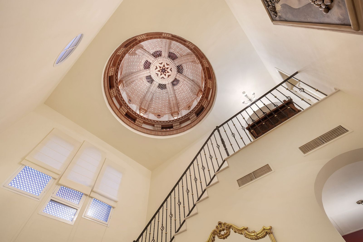 Sole Agent. This stunning Mediterranean style villa benefits from privileged position and panoramic views in exclusive residential area of La Quinta, Sitting on the generous size corner plot and surrounded by green area the villa delights from the first sight - the true masterpiece of a Spanish architect blends Mediterranean elegance with unique features as are the eye catching dome at the entrance of the property or antique entrance door and columns. The quality of materials used throughout the house and high standards of construction make this home a representation of timeless luxury. The villa is built over three levels, The entrance level consists of: impressive hall with high ceiling featuring unique dome, large living room with wood burning fireplace, formal dining room, glassed in terrace with pool table, country size kitchen with breakfast area and another glassed in terrace used as TV room. On this floor there is also a good size guest bedroom with en-suite bathroom and private mountain view terrace, and a guest toilet. Beautiful marble staircase takes to the upper level where there are two guest bedrooms with en-suite bathrooms and master suite with walk through dressing area, large bathroom with jacuzzi and extensive terrace with breath-taking sea & mountain views. All the bathrooms are of cream marble, come with UFH and plenty of natural light. Air conditioning hot/cold is installed throughout, with individual units per room as well as central heating by radiators.
