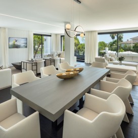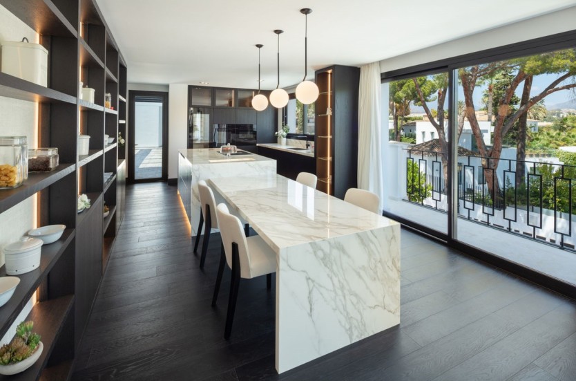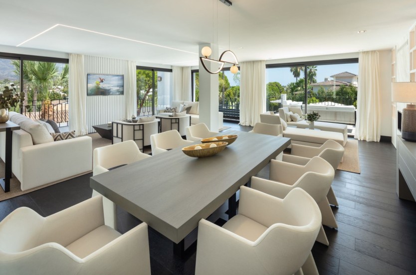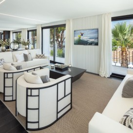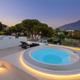 An amazing 5 bedroom villa set in the heart pf the Nueva Andalucia Golf Valley on a spacious plot of 1218 m2. South/east facing with spectacular panoramic golf and sea views. The ground floor boasts a contemporary open-plan living and dining area. The fully fitted kitchen combines marble and oak wood for a sophisticated finish and is equipped with high-end Miele appliances. The lounge boasts floor-to-celling windows and a modern fireplace. Direct access to the garden and the amazing pool area with integrated sun beds, an exterior dining area and chill-out terraces.This spacious villa boasts 1 en-suite master bedroom with direct access to the swimming pool.