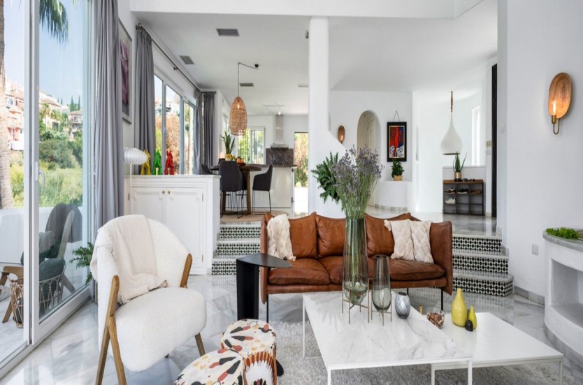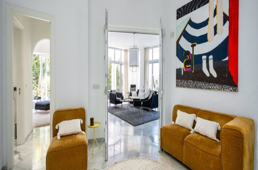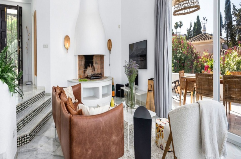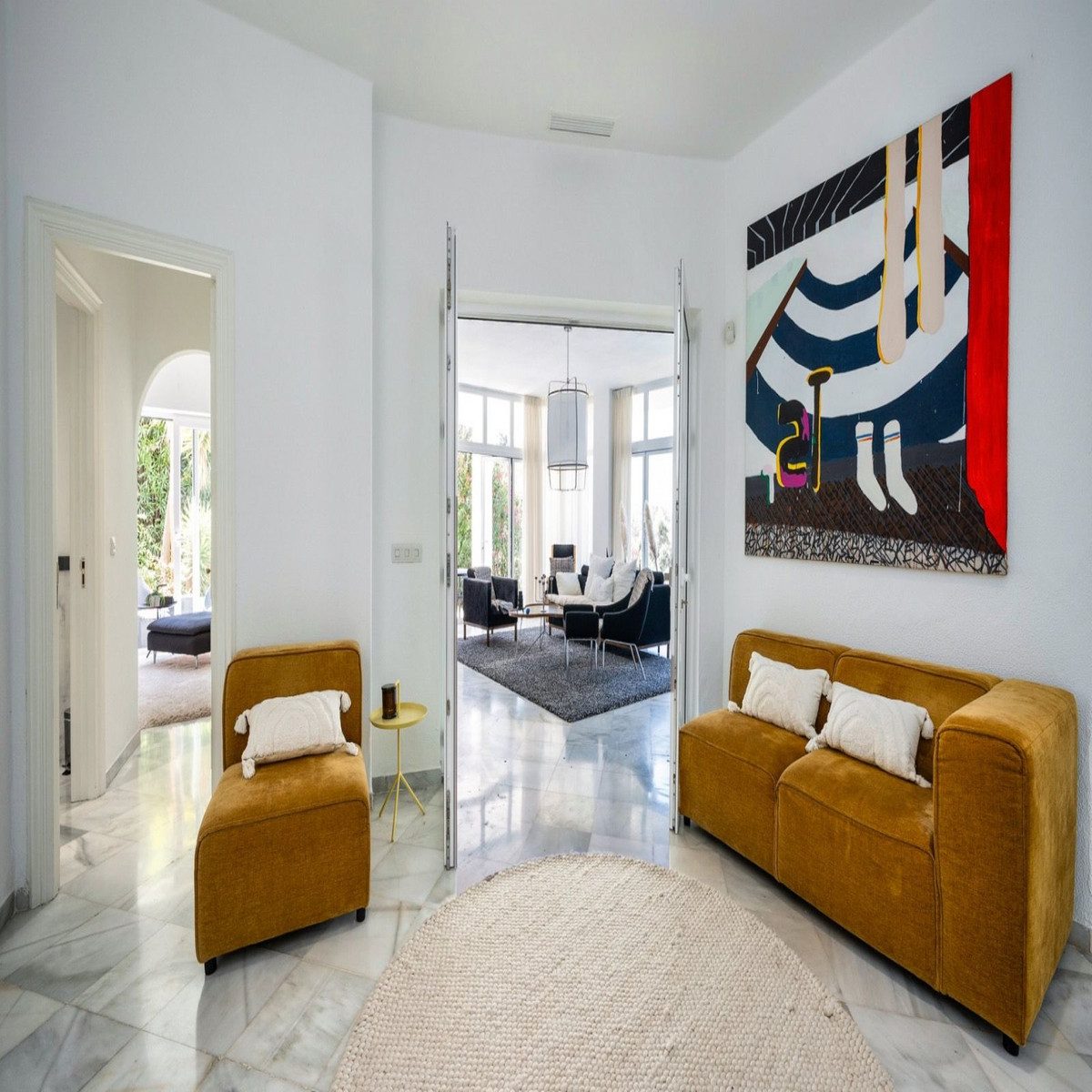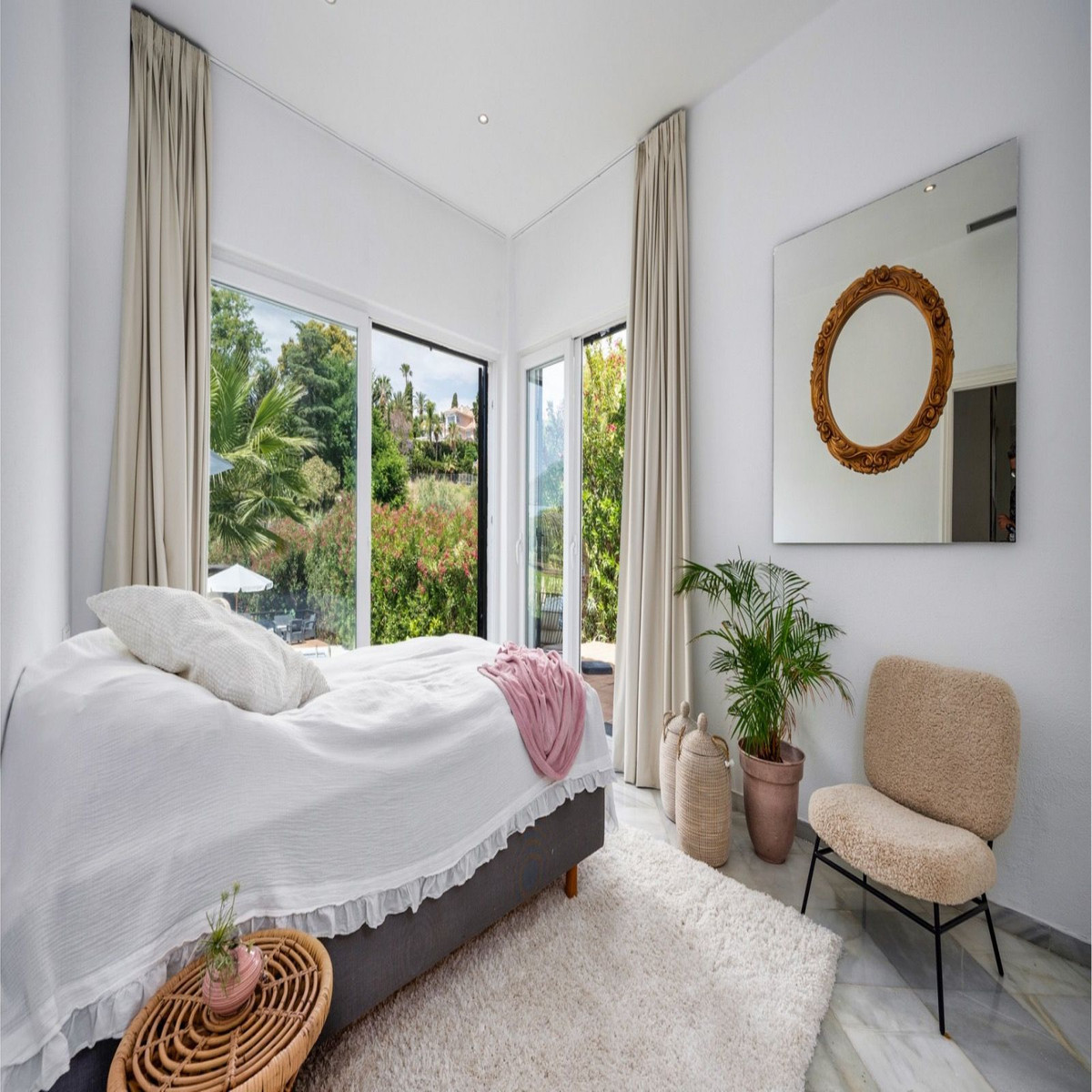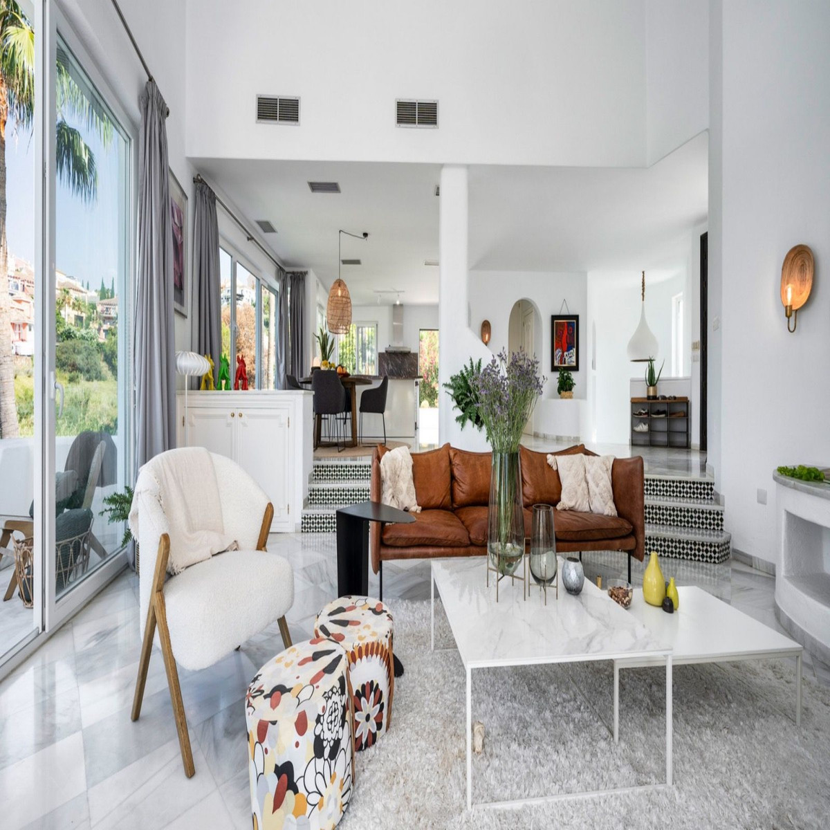 Welcome to Casa María, an exclusive villa with a serene view of the golf course. This 4-bedroom property, priced at €2,250,000, offers an incredible opportunity for those who appreciate both golf and the tranquility of nature.Situated on a spacious 1,884 m2 plot in the sought after area of Nueva Andalucía, this southwest facing villa was built in 1982 and is distributed over two floors with a total built area of 318 m2. The property has 4 bedrooms, 3 bathrooms and a guest toilet, designed for comfortable living.Casa Maria flaunts a beautiful Scandinavian-style design, with large, spacious rooms that are in need of renovation. This presents a great opportunity for the buyer to put their own stamp on this spacious villa, especially as the owner has renderings for a new project, although license approval is still pending.Upon entering the villa, one is immediately drawn to the beautiful open views to the garden and golf course. The main level features an open plan fully equipped kitchen that leads to a dining room and a spacious living room adorned with a fireplace. This level also houses one of the largest bedrooms and a bathroom, offering easy access to the sunny terrace from all sides.